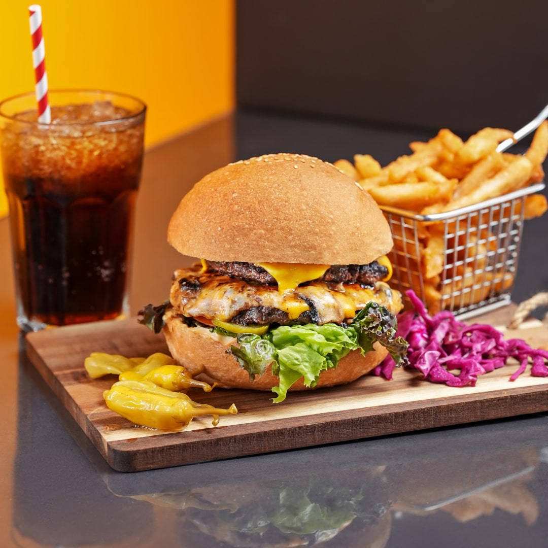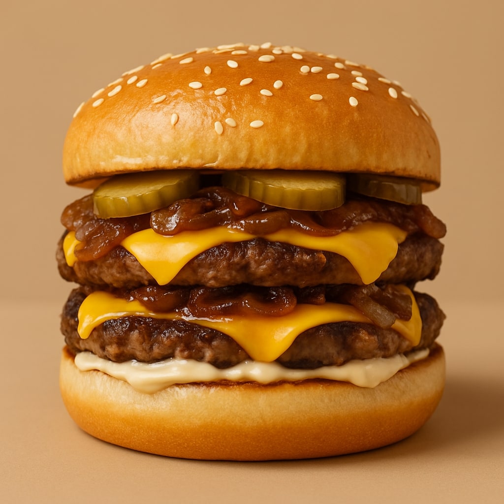 The Double Burger at Mr. Poutin is built for serious appetites and bold flavor lovers. Featuring two grilled ground beef patties, this burger is stacked with sweet caramelized onions, crunchy pickles, and our rich, signature house sauce, all held together in a toasted bun. It’s a no-compromise, double-layered classic that delivers extra satisfaction with every bite.