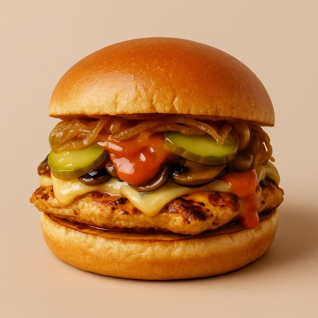 Grilled chicken, sautéed mushrooms, caramelized onion, cheese, pickles, and spicy sauce—all in one bold bite.